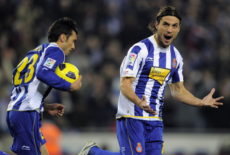 Espanyol’s Argentinian forward Daniel Osvaldo (R) celebrates his goal during the Spanish league football match Espanyol RDC vs FC Barcelona on December 18, 2010 at the Cornella-El Prat stadium in Cornella de Llobregat. AFP PHOTO/ JOSEP LAGO (Photo credit should read JOSEP LAGO/AFP/Getty Images)
