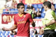 AS Roma defender Jose’ Angel, of Spain, left, appeals to Referee Gabriele Gava after receiving a red card during a Serie A soccer match between AS Roma and Cagliari, at Rome’s Olympic stadium, Sunday, Sept. 11, 2011. (AP Photo/Riccardo De Luca)