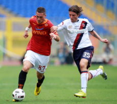 ROME – SEPTEMBER 19: Marco Rosi (L) of AS Roma and Daniele Paponi of Bologna FC compete for the ball during the Serie A match between AS Roma and Bologna FC at Stadio Olimpico on September 19, 2010 in Rome, Italy. (Photo by Paolo Bruno/Getty Images)