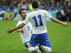 Bosnia’s midfielder Miralem Pjanic (L) congratulates forward Edin Dzeko after he scored a goal during the UEFA Euro 2012 Group D qualifying football match France vs. Bosnia-Herzegovina at the Stade de France in Saint-Denis, a northern suburb of Paris, on October 11, 2011. AFP PHOTO / BERTRAND GUAY (Photo credit should read BERTRAND GUAY/AFP/Getty Images)