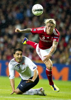 Denmark ‘s Simon Kjaer (R) is challenged by Norway’s Mohammed Abdellaoue during their Euro 2012 Group H qualifying football match at Parken Stadium in Copenhagen on September 6, 2011.