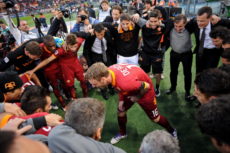 AS Roma’s midfielder Daniele De Rossi (C) talks with teammates before the Italian Serie A football match between AS Roma and AC Milan, on October 29, 2011, at Rome’s Olympic stadium. AC Milan won 3-2. AFP PHOTO / ANDREAS SOLARO (Photo credit should read ANDREAS SOLARO/AFP/Getty Images)