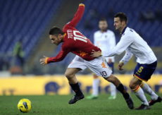 AS Roma’s forward Francesco Totti (L) vies for the ball with Lecce’s defender Andrea Esposito during the Italian A series football match between AS Roma and Lecce, in Rome’s Olympic Stadium, on November 20 , 2011. AFP PHOTO / Filippo MONTEFORTE (Photo credit should read FILIPPO MONTEFORTE/AFP/Getty Images)