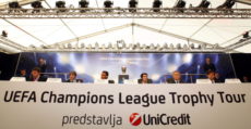 BELGRADE, SERBIA – OCTOBER 14: (L-R) Milan Boskovic, Stevan Stojanovic, Ruud Gullit,Luis Figo, Klaus Priverschek, Chairman of UniCredit Serbia and Kimmo Bellmann,UEFA Communications during press conference of the UEFA Champions League Trophy Tour 2011 on October 14, 2011 in Belgrade, Serbia. (Photo by Srdjan Stevanovic/Getty Images)