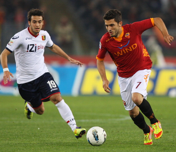 ROME, ITALY – MARCH 19: Alhassan Masahudu (L) of Genoa CFC competes for the ball with Marco Antonio Marquinho of AS Roma during the Serie A match between AS Roma and Genoa CFC at Stadio Olimpico on March 19, 2012 in Rome, Italy. (Photo by Paolo Bruno/Getty Images)