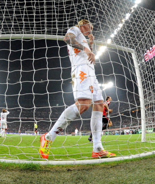 MILAN, ITALY – MARCH 24: Simon Kjaer of Roma shows his dejection after Zlatan Ibrahimovic scores his second goal of the match during the Serie A match between AC Milan and AS Roma at Stadio Giuseppe Meazza on March 24, 2012 in Milan, Italy. (Photo by Dino Panato/Getty Images)