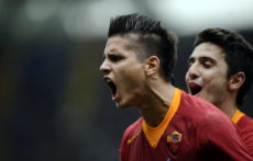 AS Roma’s Argentinian forward Erik Manuel Lamela celebrates with his teammate Brazilian midfielder Marquinho after scoring against Novara during their Italian Serie A football match at the Olympic Stadium in Rome on April 1, 2012. AFP PHOTO / FILIPPO MONTEFORTE (Photo credit should read FILIPPO MONTEFORTE/AFP/Getty Images)