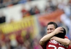AS Roma’s Brazilian midfielder Fabio Enrique Simplicio (L) celebrates with teammate Francesco Totti after scoring against Novara during their Serie A football match in Rome’s Olympic Stadium on April 1, 2012. AFP PHOTO / Filippo MONTEFORTE (Photo credit should read FILIPPO MONTEFORTE/AFP/Getty Images)