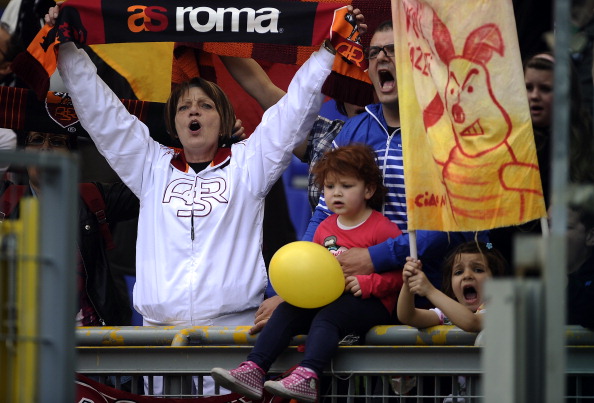 AS Roma’s supporters cheer on April 1, 2 AS Roma’s supporters cheer on April 1, 2012 during a Serie A football match against Novara at Rome’s Olympic stadium. AFP PHOTO / Filippo MONTEFORTE (Photo credit should read FILIPPO MONTEFORTE/AFP/Getty Images)