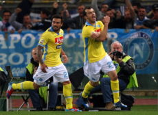 ROME, ITALY – APRIL 07: Goran Pandev (R) of SSC Napoli celebrates with his team-mate Ezequiel Lavezzi after scoring his team’s first goal during the Serie A match between SS Lazio and SSC Napoli at Stadio Olimpico on April 7, 2012 in Rome, Italy. (Photo by Paolo Bruno/Getty Images)