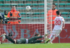 AS Bari v Reggina Calcio – Serie B BARI, ITALY – MARCH 11: Adrian Stoian (R) of Bari scores Bari’s second goal during the Serie B match between AS Bari and Reggina Calcio at Stadio San Nicola on March 11, 2012 in Bari, Italy. (Photo by Giuseppe Bellini/Getty Images)