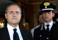 Rome, ITALY: SS Lazio President Claudio Lotito (L) leaves a hotel in downtown Rome, 22 July 2006, where the four clubs hit by sanctions in the Italian match-fixing trial began their appeals at the federal court. Juventus, Lazio, Fiorentina and AC Milan were all punished for breaking Italian Football Federation (FIGC) rules with the first three relegated to Serie B and the latter given a 15-point penalty for next season. AFP PHOTO / Andreas SOLARO (Photo credit should read ANDREAS SOLARO/AFP/Getty Images)