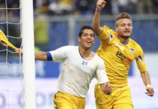 GENOA, ITALY – MAY 20: Gianluca Caprari (L) of Pescara Calcio celebrates whit his team mates Ciro Immobile (R) after scoring the opening goal during the Serie B match between UC Sampdoria and Pescara Calcio at Luigi Ferraris Stadium on May 20, 2012 in Genoa, Italy. (Photo by Marco Luzzani/Getty Images)