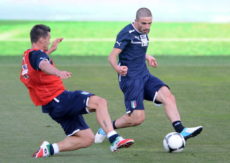 Italy’s national football team players Christian Maggio (L) and Fabio Borini train on May 28,2012 at the Ennio Tardini stadium in Parma, on the eve of a friendly match against Luxembourg ahead of the Euro 2012 championship, which will take place in Poland and Ukraine from June 8 to July 1. AFP PHOTO / ALBERTO LINGRIA (Photo credit should read ALBERTO LINGRIA/AFP/GettyImages)