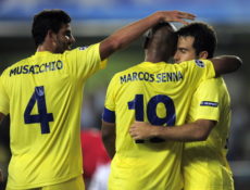 Villarreal’s Argentinian defender Mateo Musacchio (L) and Villarreal’s midfielder Marcos Senna (C) congratulate Villarreal’s Italian forward Giuseppe Rossi on scoring against Odense during their UEFA Champions League play off second leg football match at El Madrigal stadium in Villareal on August 23, 2011. Villarreal won 3-0. AFP PHOTO/ JOSEP LAGO (Photo credit should read JOSEP LAGO/AFP/Getty Images)