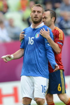 Spanish midfielder Andres Iniesta reacts with Italian midfielder Daniele De Rossi during the Euro 2012 championships football match Spain vs Italy on June 10, 2012 at the Gdansk Arena. AFP PHOTO / CHRISTOF STACHE (Photo credit should read CHRISTOF STACHE/AFP/GettyImages)
