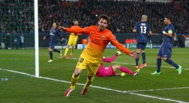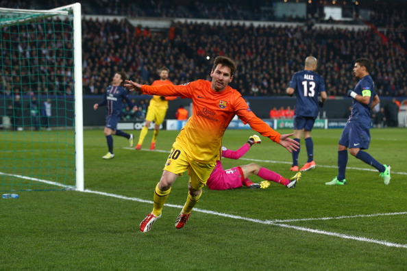 PARIS, FRANCE – APRIL 02: Lionel Messi of Barcelona celebrates scoring the opening goal during the UEFA Champions League Quarter Final match between Paris Saint-Germain and Barcelona FCB at Parc des Princes on April 2, 2013 in Paris, France. (Photo by Clive Rose/Getty Images)